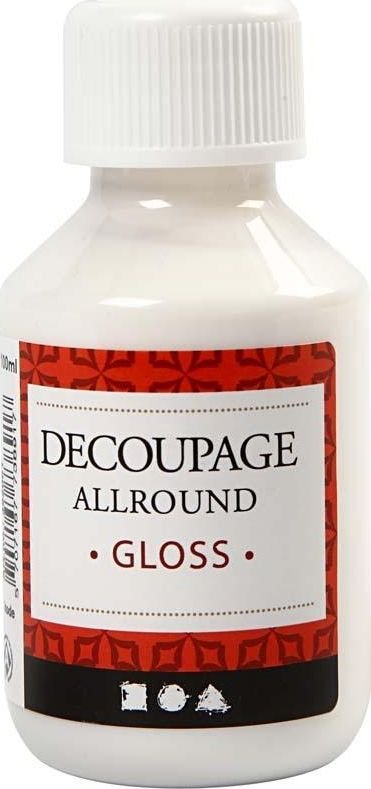 Den vattenbaserade och vattenavvisande lacken är perfekt för en mängd olika decoupageprojekt och den kan användas på trä, kartong och plast. Vår decoupagelack har alla de egenskaper som krävs: Den är perfekt för servetter och pappersutklipp när lacken har torkat kan du torka av dem och du kan använda den både som lim och medium. Använder du lacken för att göra decoupage gör du bara så här: applicera lacken, lägg över pappret och låt torka. Du kan sedan pensla ett eller flera lager över ytan det skyddar pappret och ger ytan en extra snygg finish. Observera! När du gör decoupage med servetter ska du endast använda servettens yttersta lager och ytan ska vara vit så att motivet sticker ut så tydligt som möjligt.