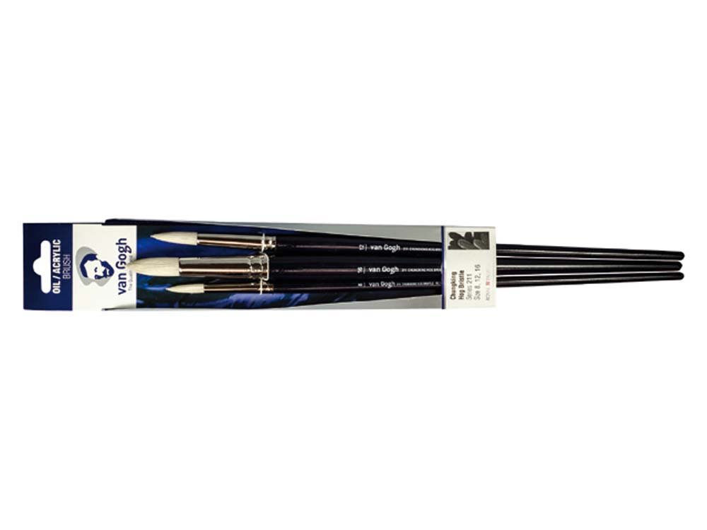 Set om 3 Van Gogh penslar med svinborst i storlek 8, 12 och 16. Långt svartlackad skaft med en rund hysla i förnicklad mässing. Lämplig till olje- och akrylmålning.